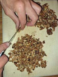 Die Nüsse werden dabei nicht nur einfach gerieben, sondern mühevoll händisch und einzeln geschnitten – das erleichtert dann hinterher die Filtration des Likörs.